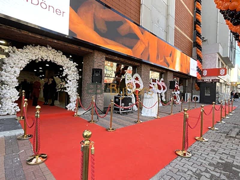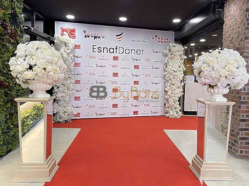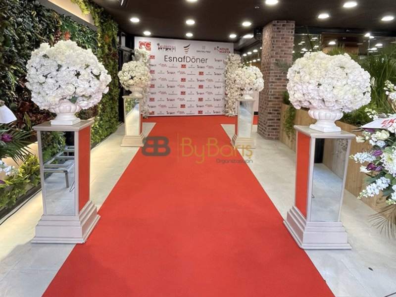 Kırmızı Halı ve Giriş Dekoru: Esnaf Döner Ümraniye Şubesi'nin açılışına özel olarak, konuklarımızı şıklıkla karşılamak için kırmızı halı serimi gerçekleştirdik. Halının etrafında özel süslemelerle, geleneksel ve şık bir atmosfer oluşturduk.