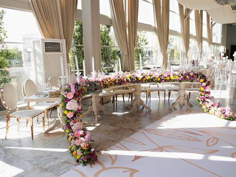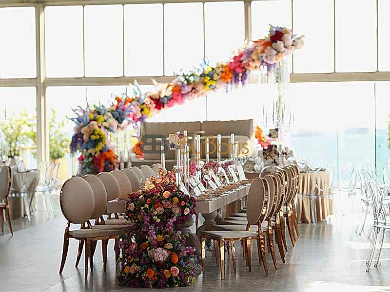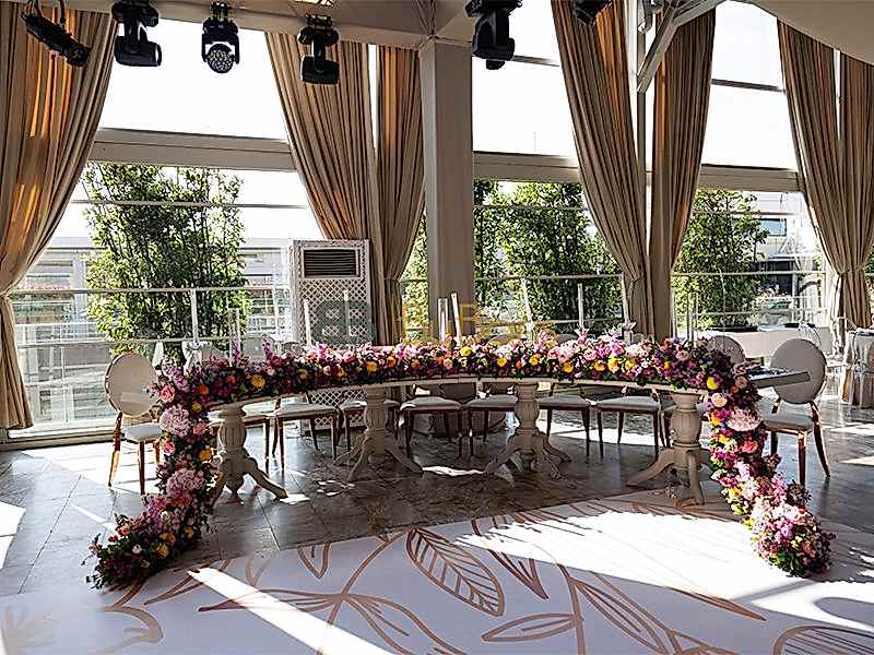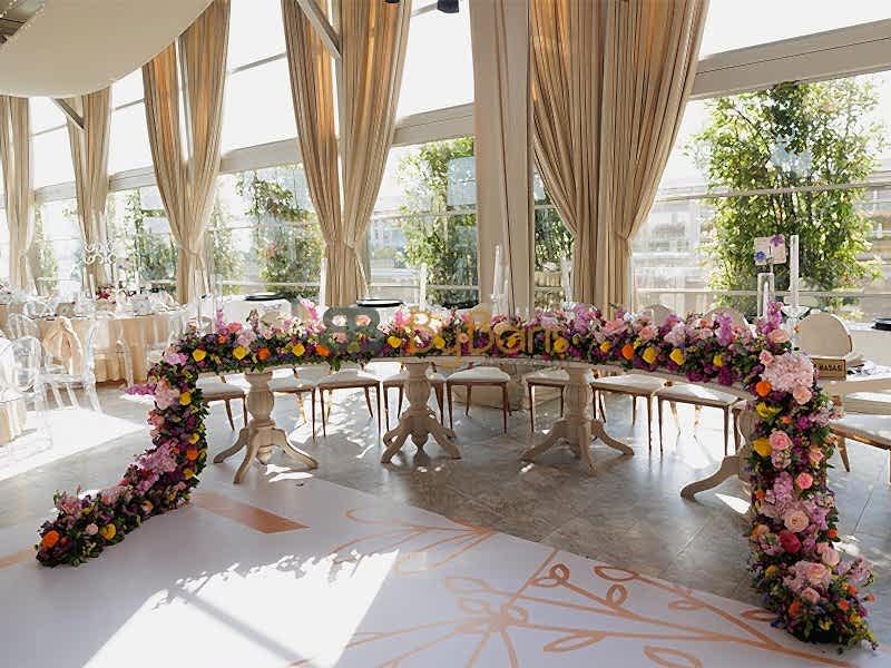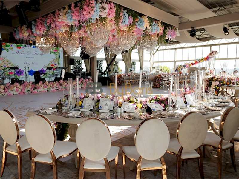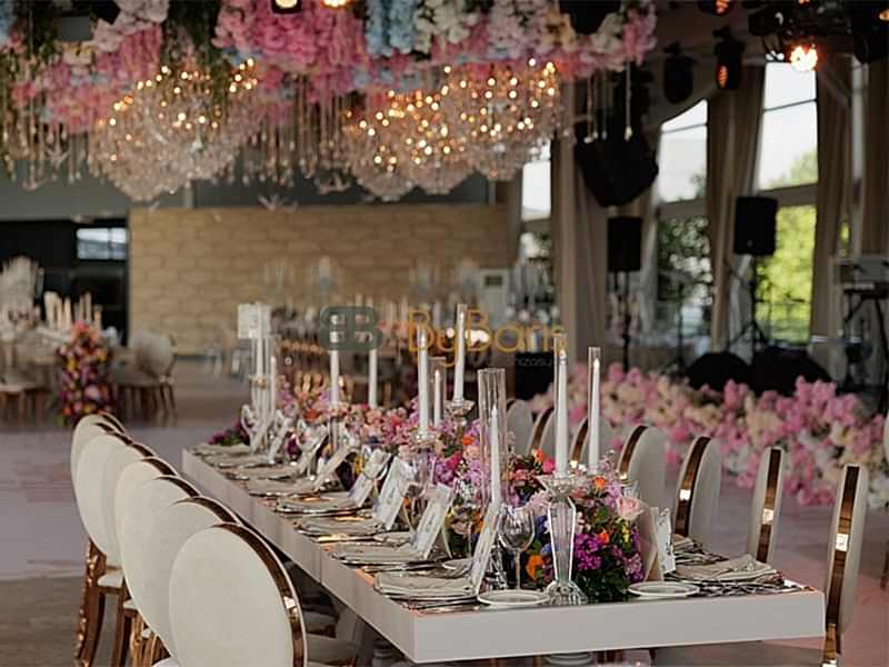 Masa ve sandalye dekorasyonu: Özel tasarım masa örtüleri, şık sandalyeler ve dekoratif detaylarla görkemli bir alan oluşturuldu.