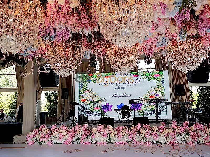 Profesyonel ses, ışık ve truss sistemleri: Düğün alanında mükemmel atmosfer yaratmak için son teknoloji ekipmanlar kullanıldı.