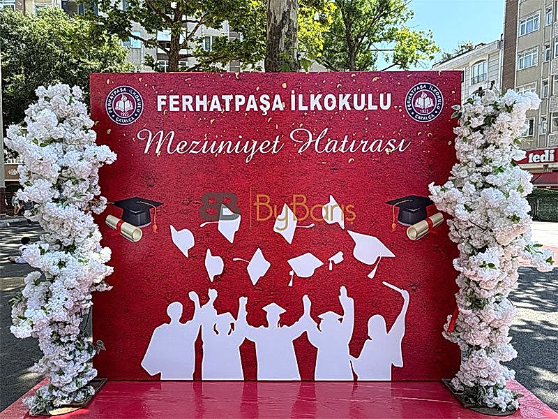 Fotoğraf Çekim Panosu: Mezuniyet hatırası için özel olarak tasarlanmış fotoğraf panosu ile unutulmaz kareler çekildi.