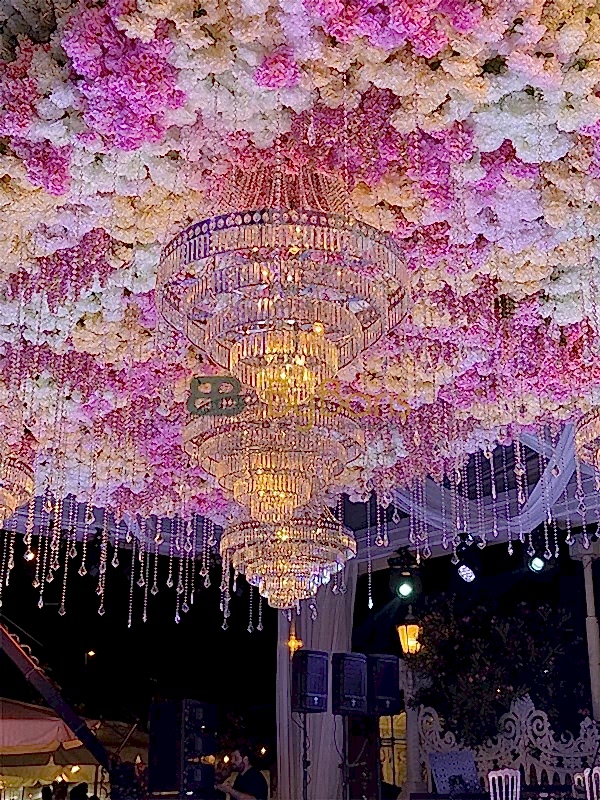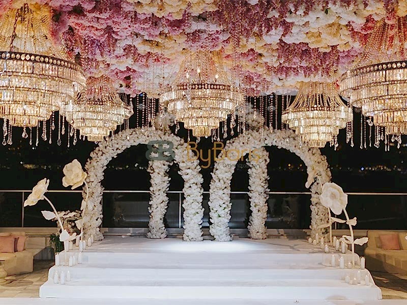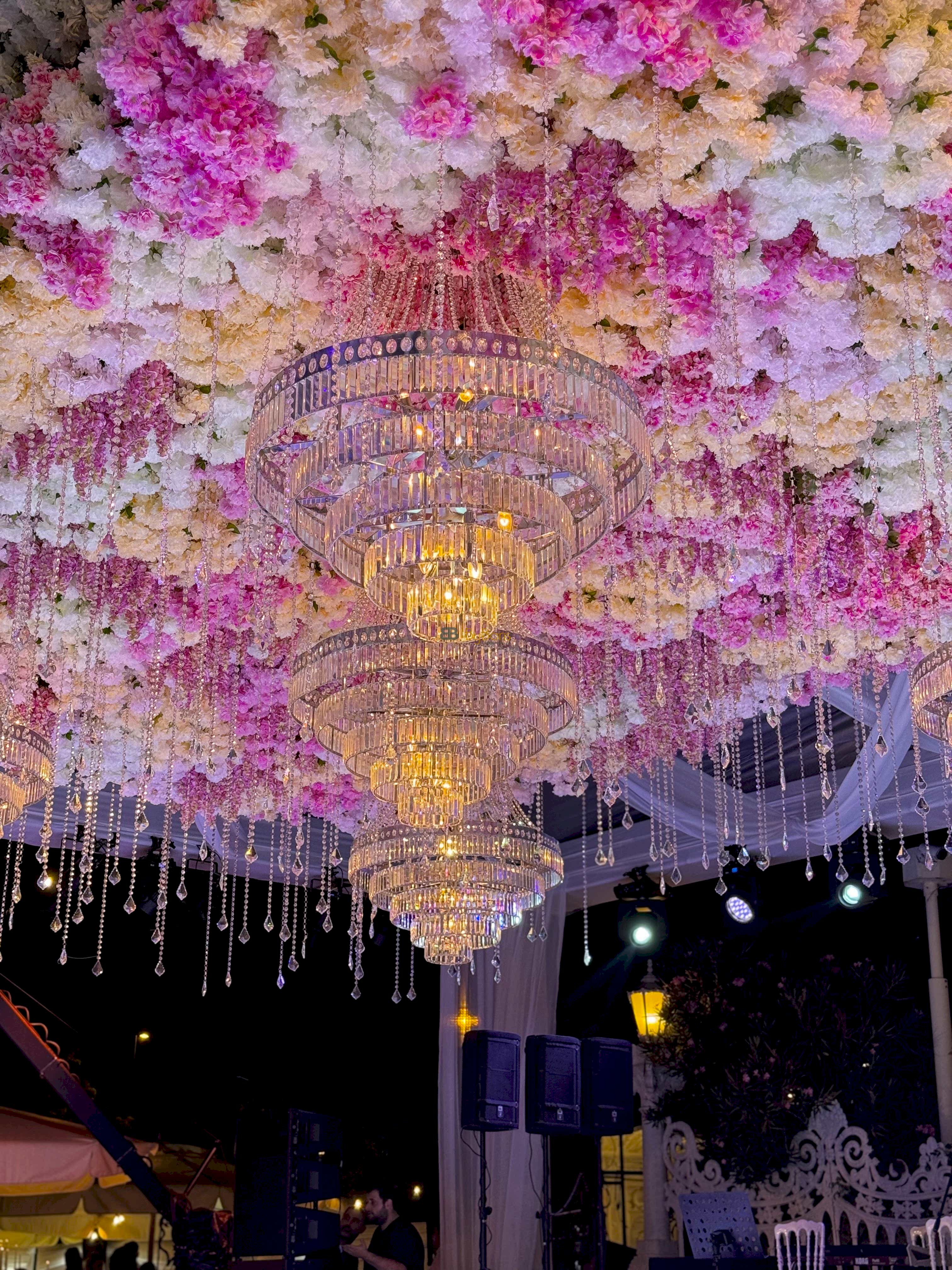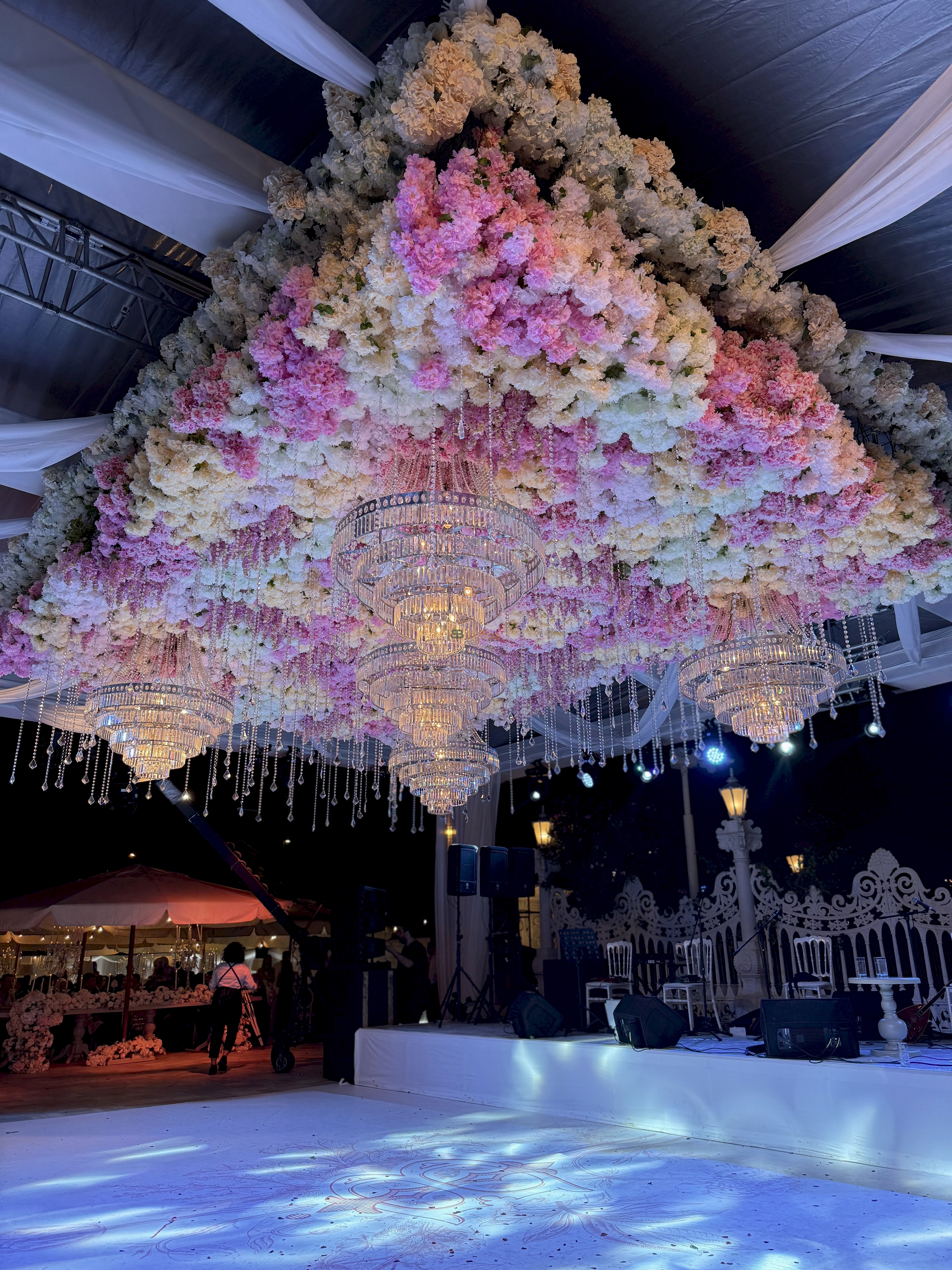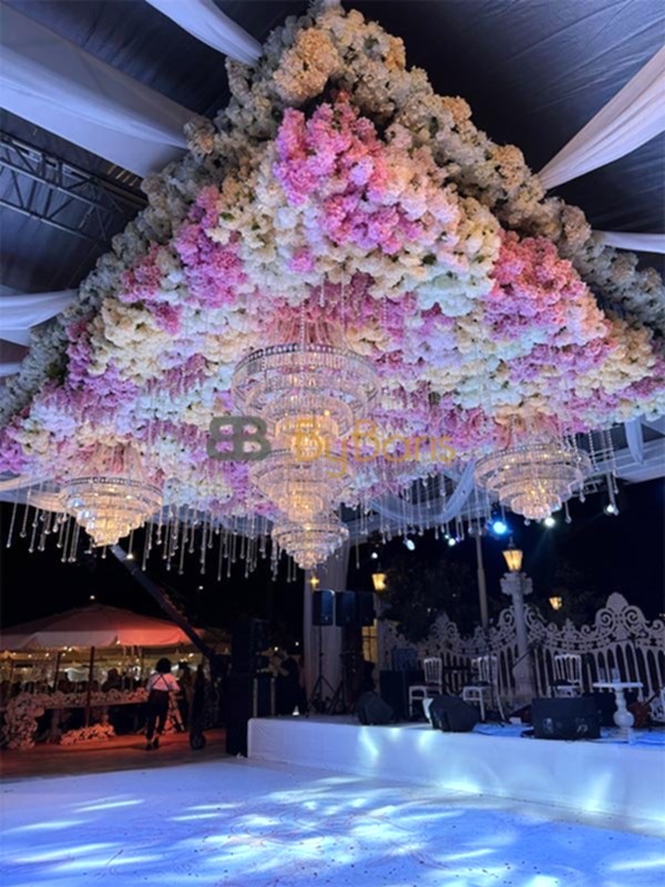 Mekânın genel atmosferini tamamlamak için tavan çiçekleri ve avize dekorları ile görkemli bir ambiyans oluşturduk. Bu dokunuşlar, düğün alanını zarif ve etkileyici hâle getirdi.