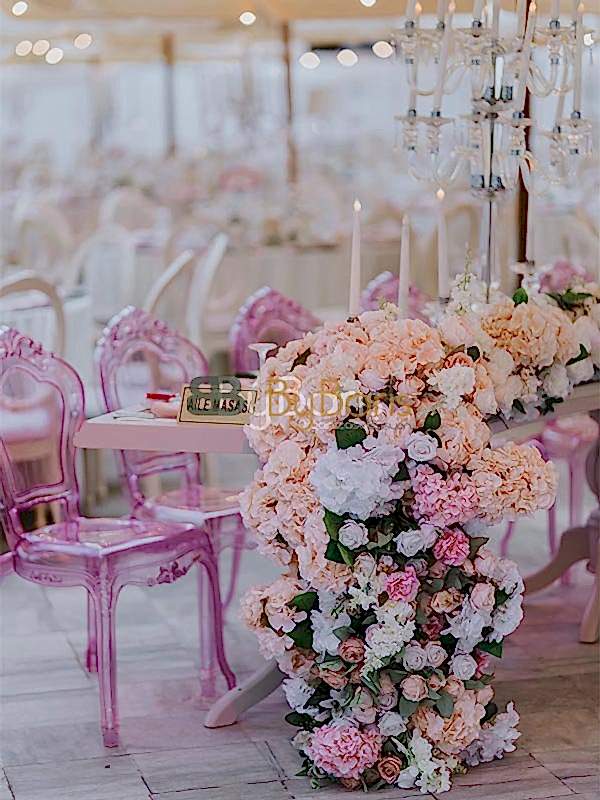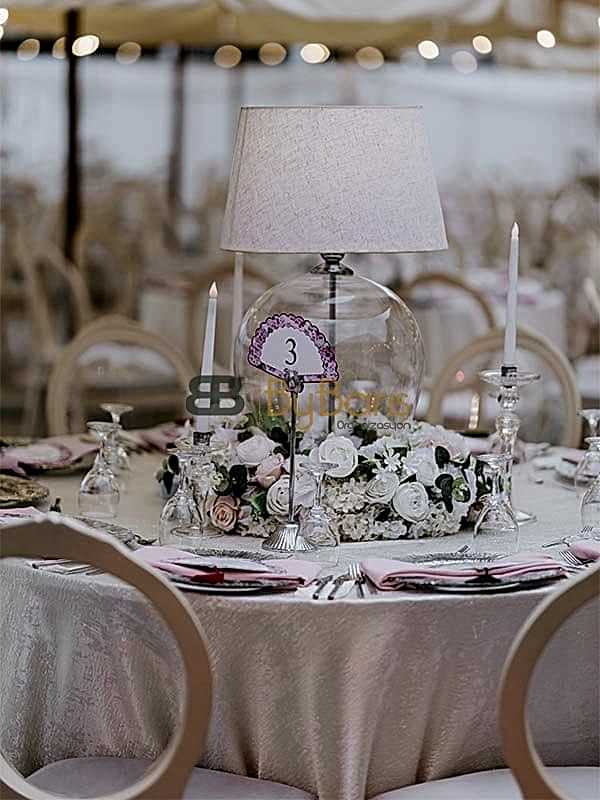 Masalara romantik ve zarif bir dokunuş eklemek için masa üstü süslemeleri ve canlı çiçek süslemeleri kullandık. Her detay, çiftimizin düğün konseptiyle uyumlu ve unutulmaz bir görsellik sunacak şekilde tasarlandı.