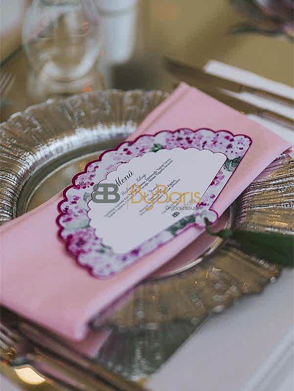 By Barış Organizasyon olarak catering hizmeti ile misafirlerin damak zevkine hitap eden özenle hazırlanmış menüler sunduk. Masalarda yer alan şık tasarımlı menü kartları ile düğün dekorasyonuna uyumlu ve estetik bir detay ekledik.