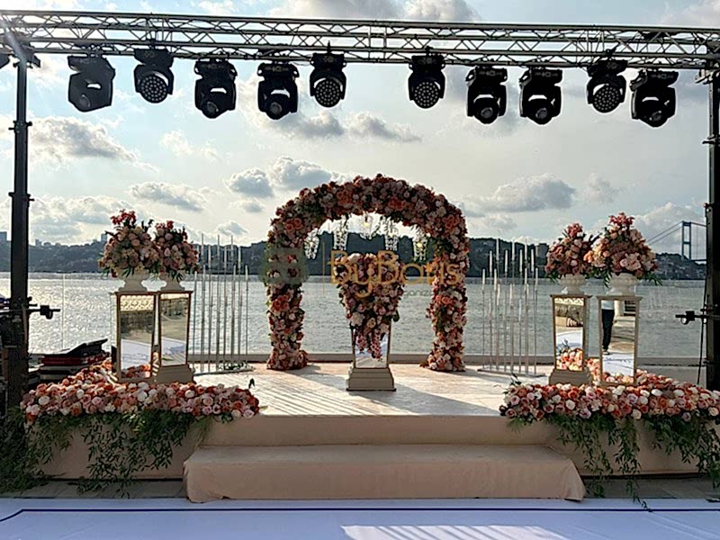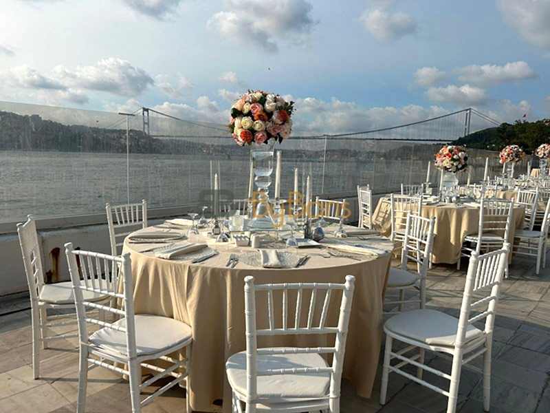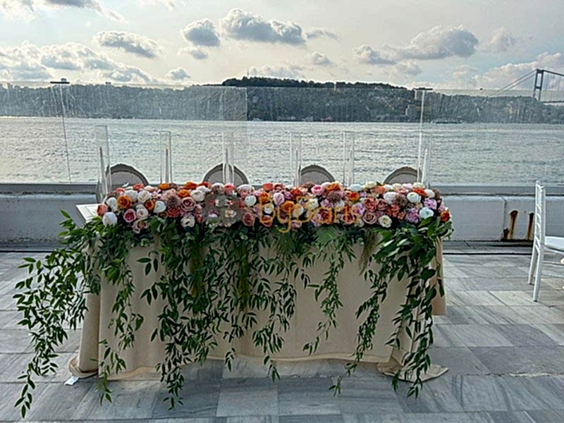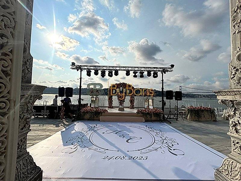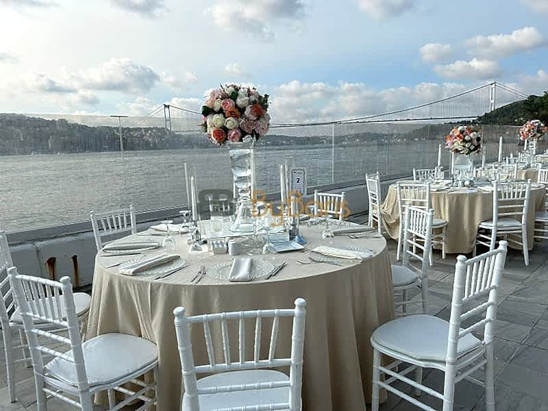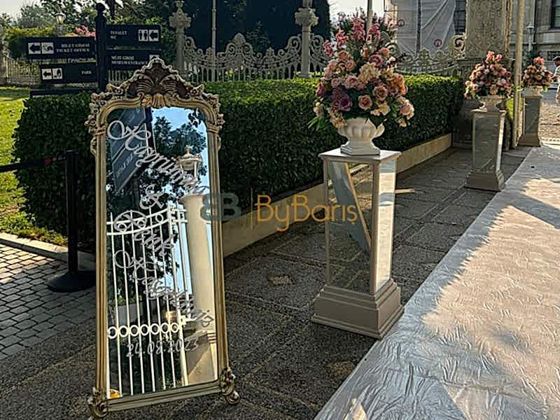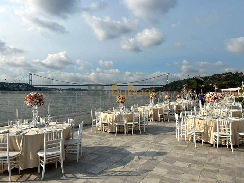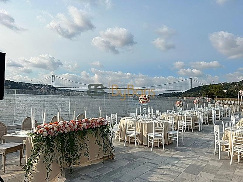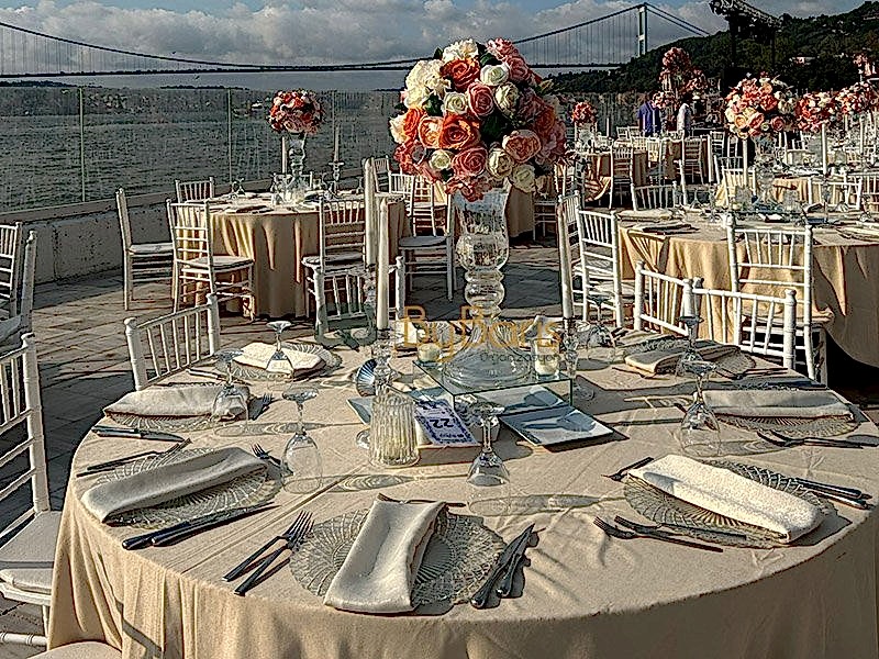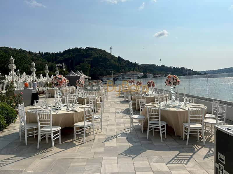 Mekan Dekorasyonu ve Tasarımı: Küçüksu Kasrı’nın tarihi ve zarif atmosferine uygun olarak, mekânın her köşesini dikkatle tasarladık. Çiftimizin istekleri doğrultusunda şık çiçek aranjmanları, zarif masa düzenlemeleri ve dekoratif detaylarla büyüleyici bir ambiyans yarattık.