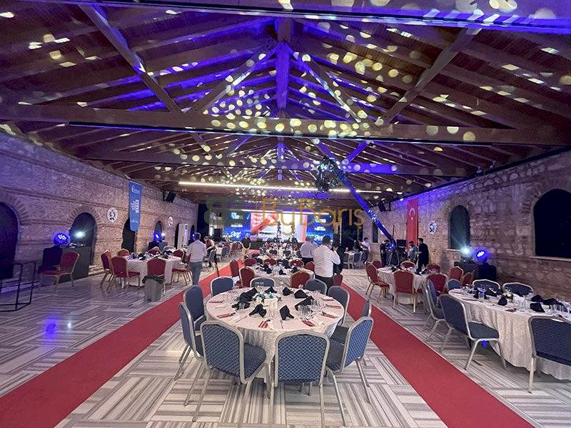 Etkinliğin iç mekanını şıklık ve zarafetle taçlandırdık. Halı kaplama dekoruyla alanın atmosferini tamamen dönüştürdük, katılımcılara sıcak ve davetkar bir ortam sunduk.Ses Sistemi Kiralama: