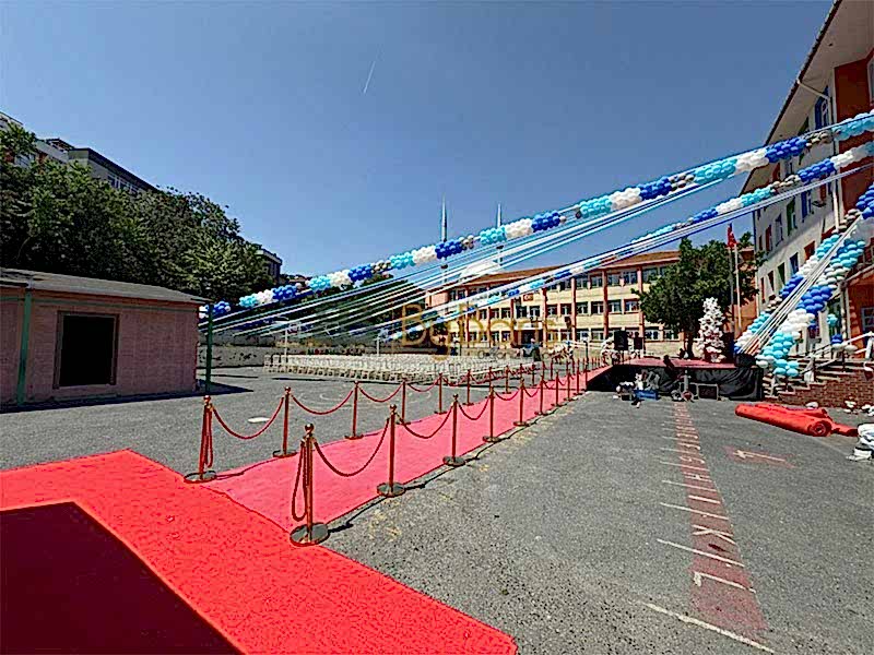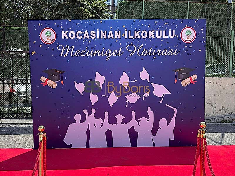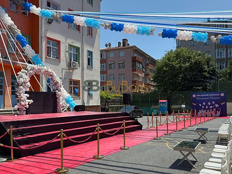 Kocasinan İlkokulu mezuniyet töreninde, yukarıdaki tüm unsurlar titizlikle planlandı ve uygulandı. Balon süslemesi, kırmızı halı kaplama ve podyum sahne kurulumu ile görsel bir bütünlük sağlanırken, animasyon gösterileri ve sihirbaz performansı ile etkinlik eğlenceli bir hale getirildi. Misafirler, lake bistro masa ve sandalye kiralama ile rahat bir oturma deneyimi yaşadı. Güvenlik ve düzen için kullanılan pirinç bariyerler ve profesyonel ses sistemi etkinliğin kusursuz ilerlemesini sağladı. Ayrıca özel fotoğraf çekim alanı, bu özel anların ölümsüzleşmesini sağladı.