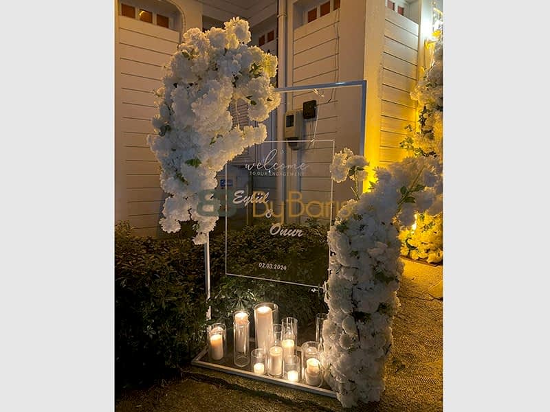 By Barış Organizasyon olarak, Eylül ve Onur çiftimizin nişan organizasyonunu büyük bir titizlikle gerçekleştirdik. Çiftimizin özel gününü unutulmaz kılmak için her detayı özenle planladık ve her aşamada mükemmelliği hedefledik. Eylül ve Onur'un hayallerindeki nişan organizasyonunu, şıklık ve zarafetten ödün vermeden tamamladık.